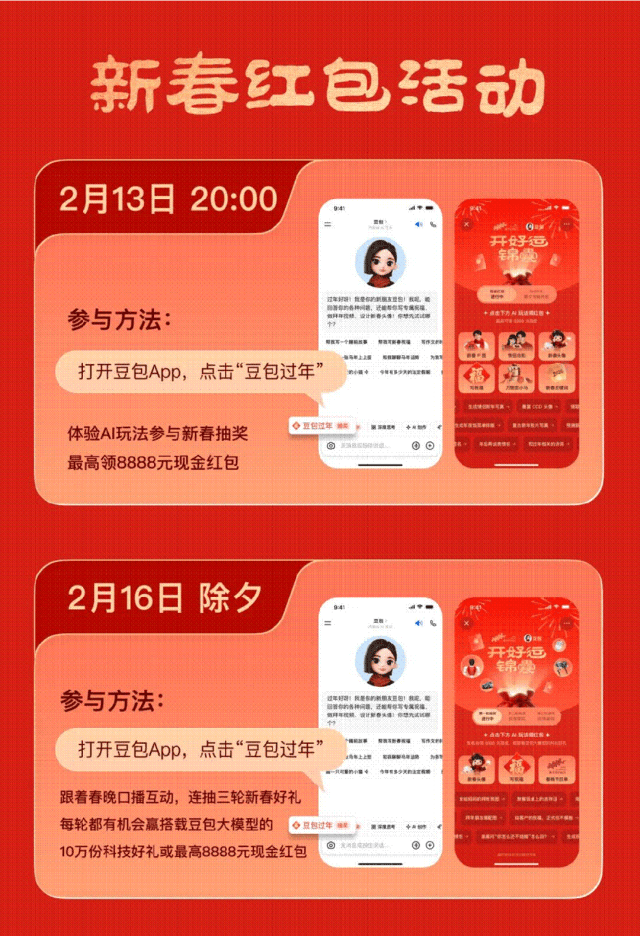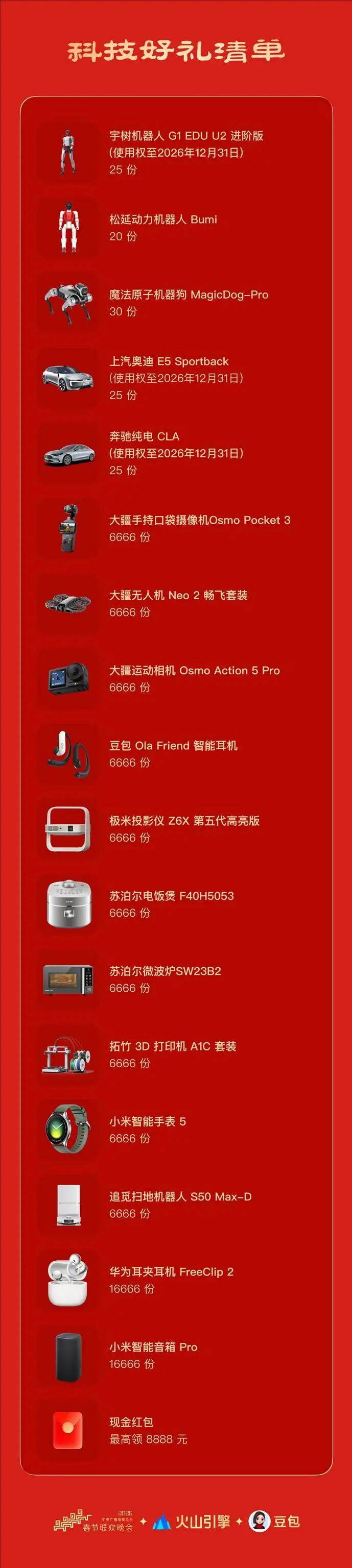 一键生成新春写实和头像,也有6666份小米智妙手表、6666份苏泊尔电饭煲等智能消费品,利用了火山引擎豆包大模子家族的狂言语模子、语音合成模子和视觉理解能力,能够表示出更拟人的音色取语气、流利的语音互动和精确的避障能力,豆包结合地方电视总台春晚,